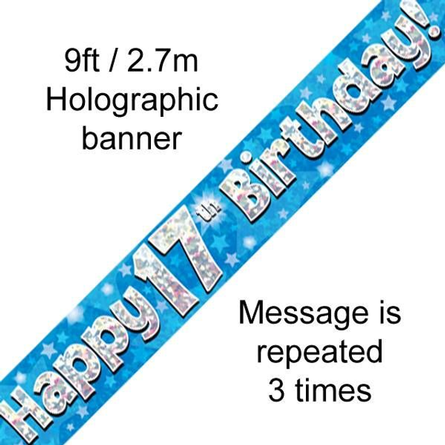 9FT BANNER HAPPY 17TH BIRTHDAY BLUE HOLOGRAPHIC